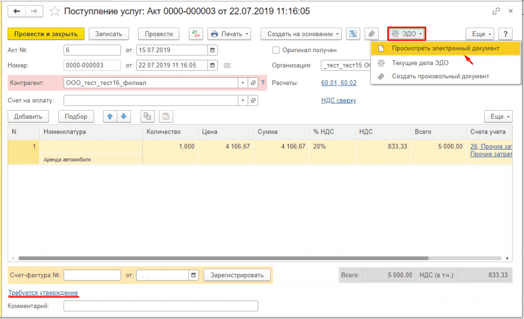 Полученный электронный документ, в зависимости от типа, может автоматически помещаться в папку «Утвердить» формы списка документов «Текущие дела ЭДО»: