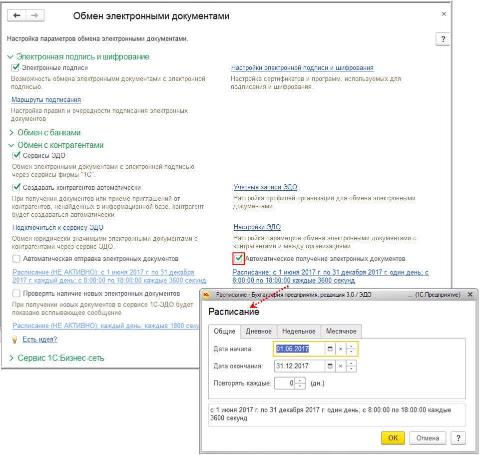 Для клиент-серверного режима работы также можно установить расписание получения электронных документов, выполнив соответствующую настройку параметров обмена электронными документами с контрагентами (раздел Администрирование - гиперссылка Обмен электронными документами):