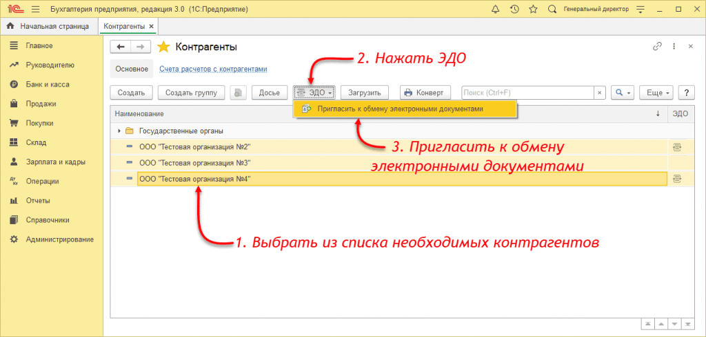 В сервисе «1С-ЭДО» имеется возможность массовой отправки приглашений контрагентам. Для этого: