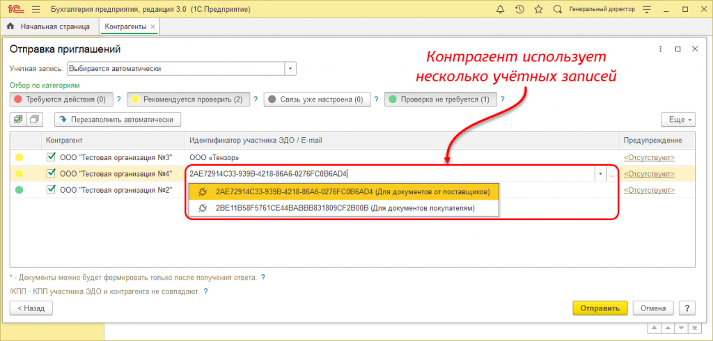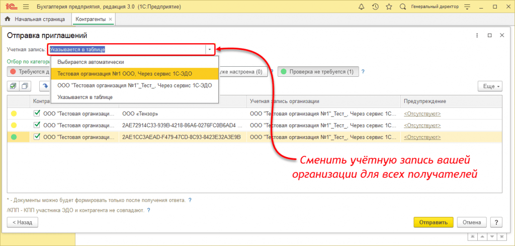 Учётную запись вашей организации можно сменить как для определённого получателя, выбрав в соответствующем поле необходимое значение, так и для всех контрагентов: