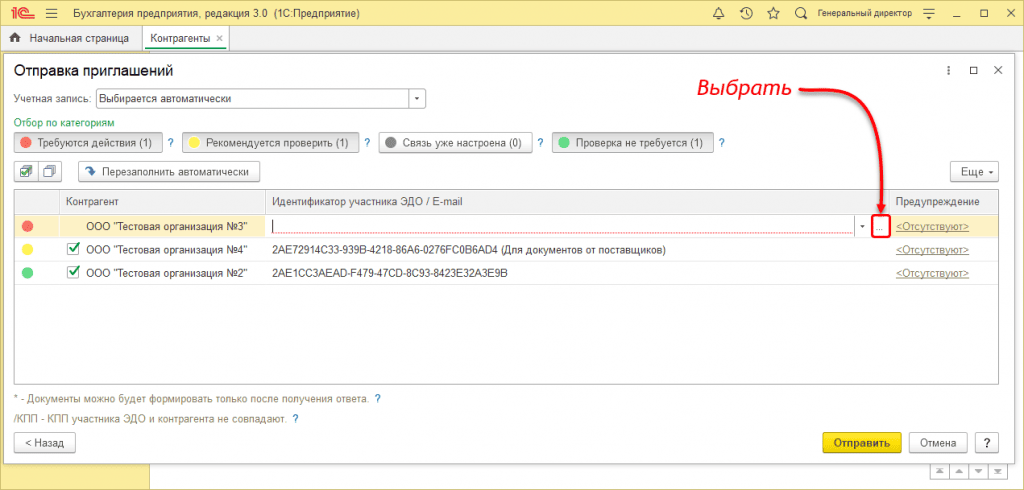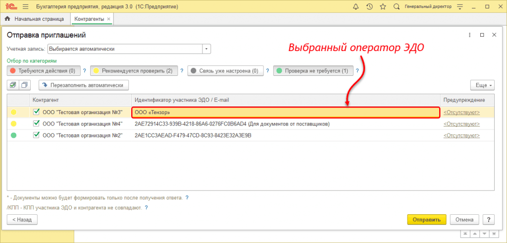 Откроется окно отправки приглашений, в котором система проверит наличие данных о контрагенте в сервисе и предложит пользователю выполнить определённые действия, которые разграничены цветовыми индикаторами.