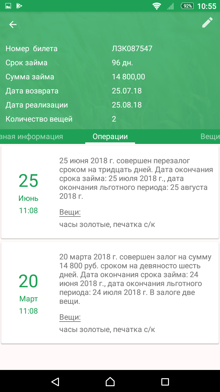 Экран билета содержит исчерпывающую информацию по залоговому билету, представленную по разделам: основная информация по залогу, операции, залоговые вещи. Тут же можно просмотреть даты и описания всех операций, залогов и контакты самого ломбарда в удобном, легко читаемом виде. Для более удобной работы с залоговыми билетами реализована возможность переименования билета.