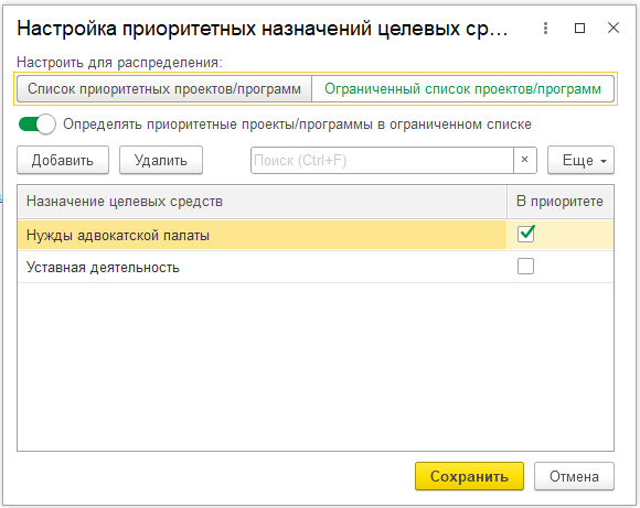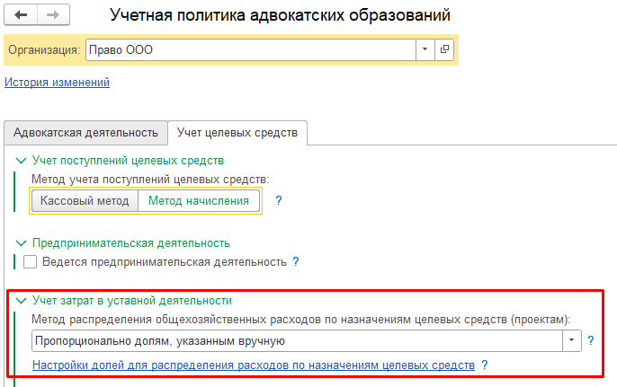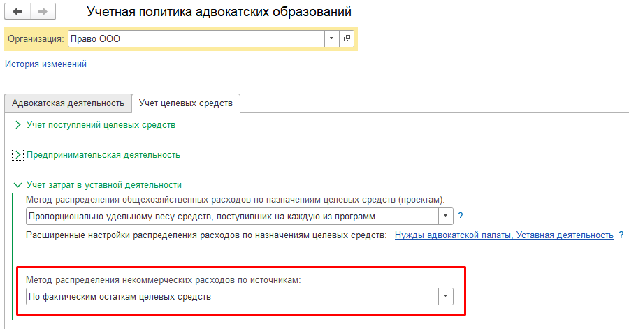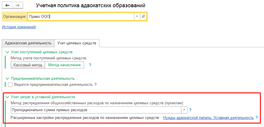 Главное → Параметры учета адвокатский образований → группа настроек «Расходы в уставной деятельности».