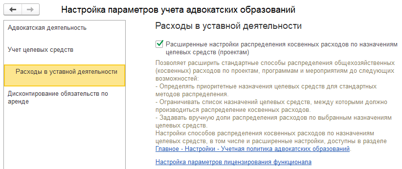 Подключение функционала выполняется установкой флага «Расширенные настройки распределения косвенных расходов по назначениям целевых средств (проектам)» в настройках параметров учета: