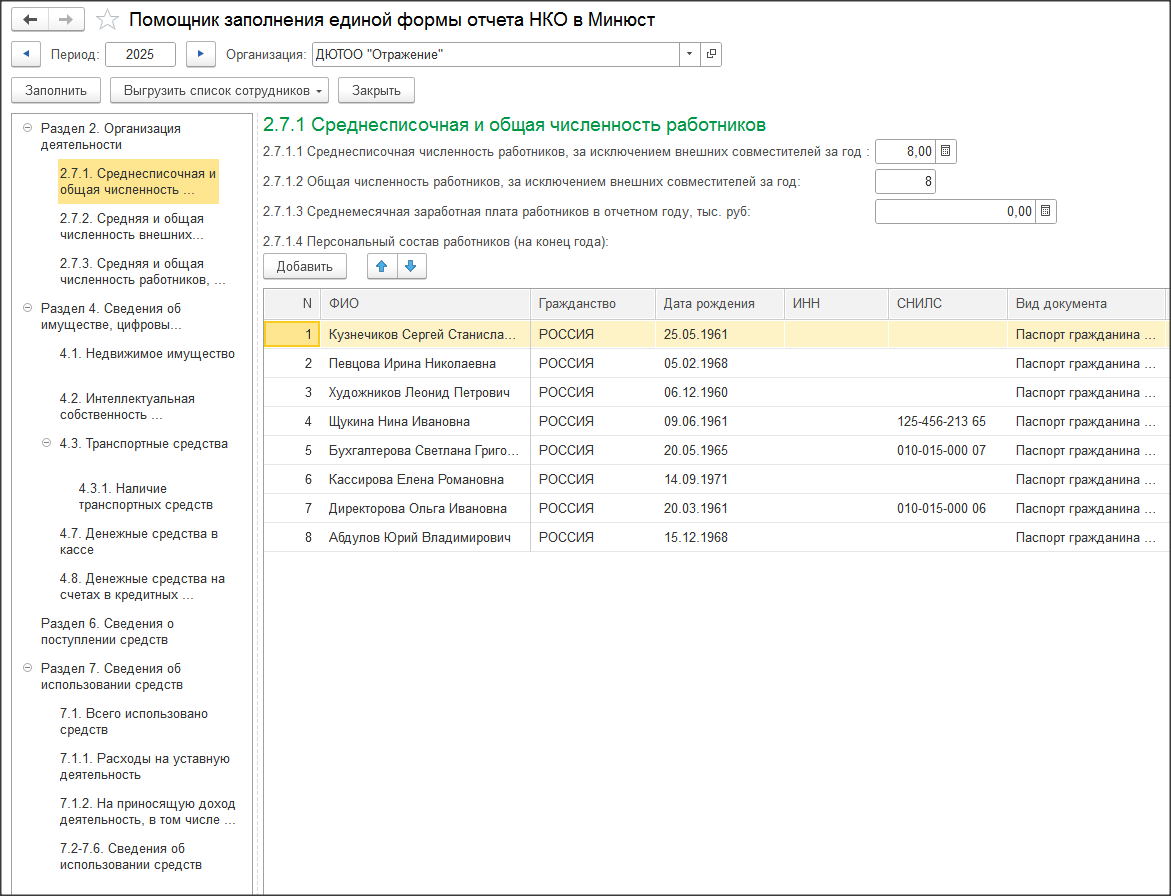 Помощник позволяет автоматически сформировать данные по ряду разделов отчета на основании учетных данных программы, просмотреть и при необходимости откорректировать их, сформировать файлы со списками сотрудников для раздела 2.7 отчета в формате шаблонов, предназначенных для загрузки на сайте Минюста, выгрузить данные остальных разделов отчета в Excel.
