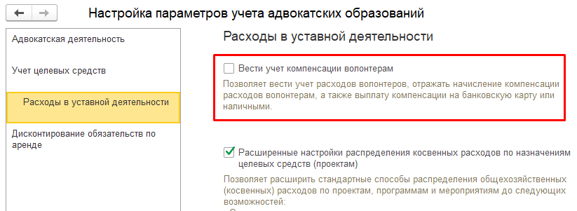 Главное → Настройка параметров учета адвокатских образований → группа настроек «Расходы в уставной деятельности».