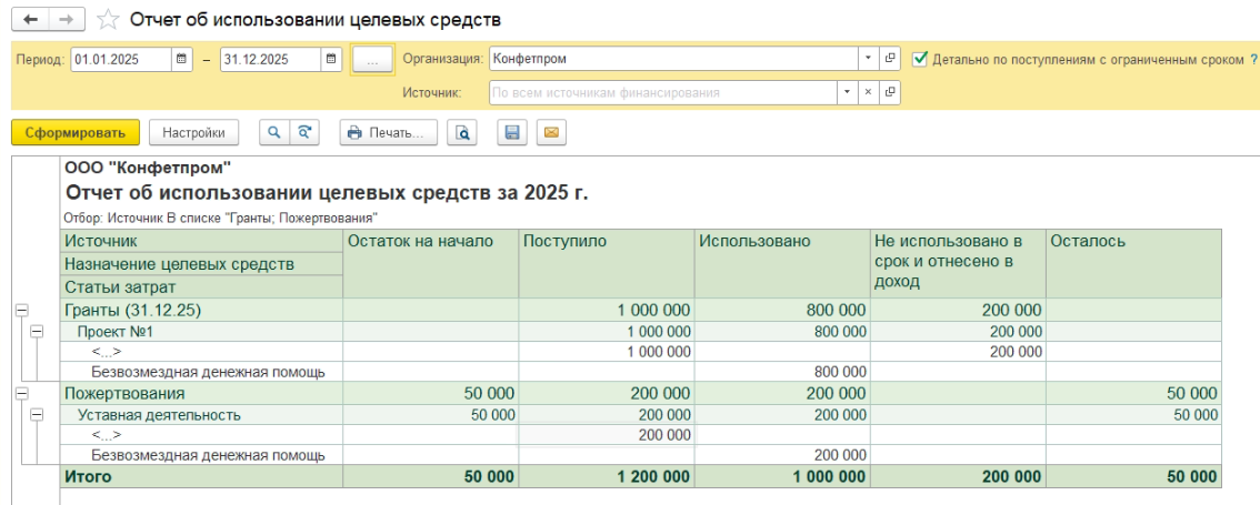Отчет также позволяет контролировать сроки использования целевых средств и видеть суммы, признанные внереализационными доходами по истечении срока использования.
