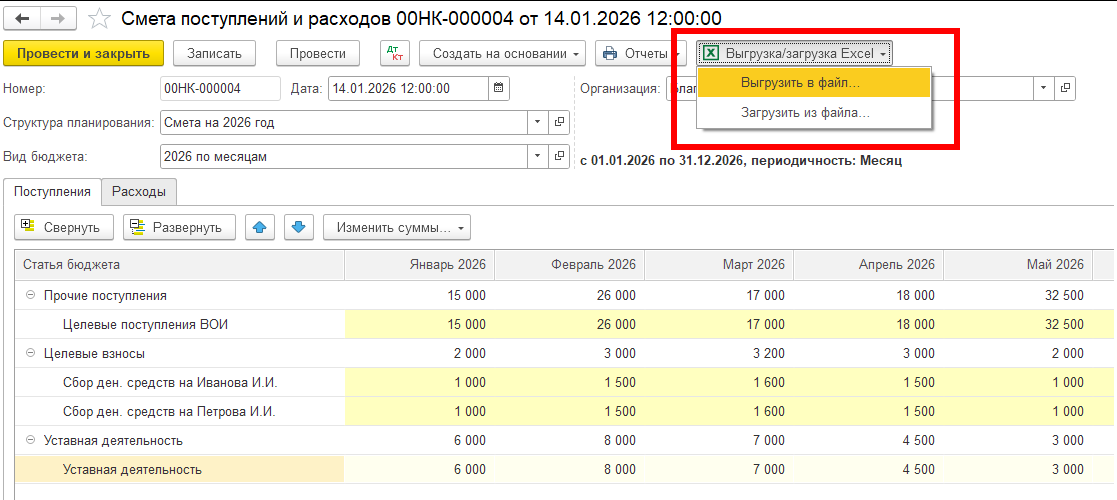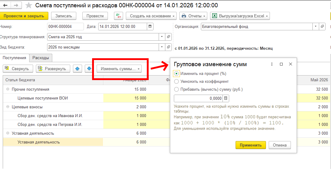 В документы «Смета поступлений и расходов» и «Корректировка сметы поступлений и расходов» внесены изменения, упрощающие ввод данных и редактирование сумм.