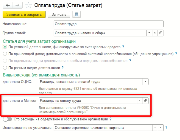 Теперь при заполнении данных о расходах в помощнике вид расхода подставляется автоматически на основании настроек статьи затрат, что снижает необходимость ручного ввода и повышает точность формирования отчетности. Для поддержки данной возможности в справочнике «Статьи затрат» добавлены поля для указания вида расхода в соответствии с классификацией Минюста.