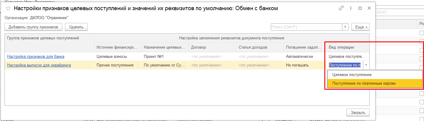 Также для каждой отдельной группы признаков целевых поступлений в настройках можно задать свой вид операции документа «Поступление на расчетный счет».