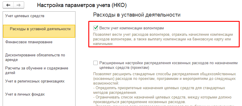 Главное → Параметры учета (НКО) → группа настроек «Расходы в уставной деятельности».