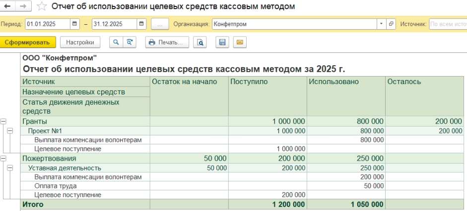 «Учет целевых средств» → группа «Отчеты» → «Отчет об использовании целевых средств кассовым методом»