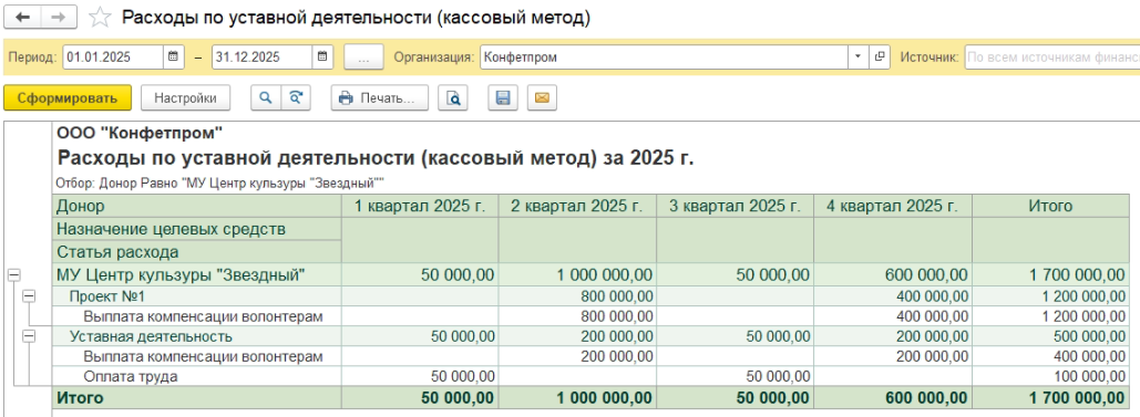 Отчет удобен как для подготовки отчетности донорам, так и для внутреннего контроля использования целевых средств, и позволяет анализировать расходы за любой период с возможностью детализации по месяцам или кварталам, выполнять отбор по конкретному донору (источнику финансирования), видеть на какие проекты были направлены средства и по каким статьям.