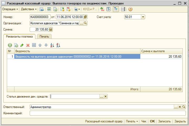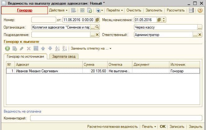 На основании начисленных гонораров возможно оформление Ведомости на выплату гонораров адвокатам через кассу или через банк, которую также можно вывести на печать: