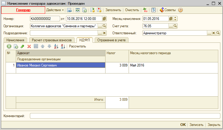 В программе 1С-Рарус: Бухгалтерия для адвокатских образований реализована возможность начислений и выплат вознаграждений адвокатам.